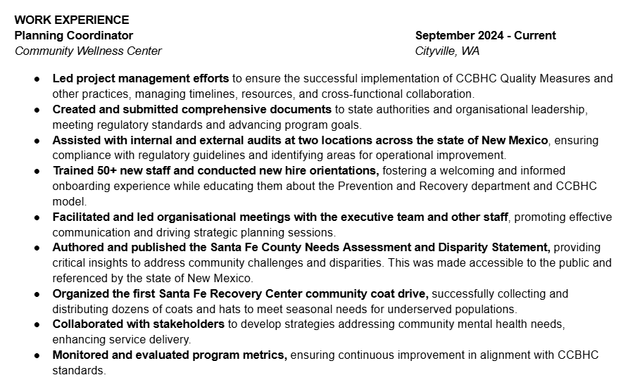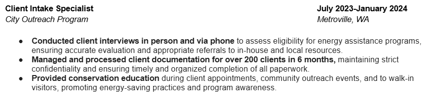 For the first job experience, use your most recent job. Include the most details and bullet points with this position.