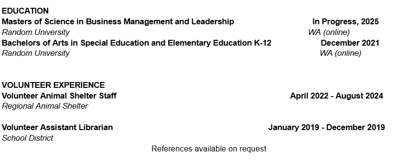 Education, Volunteer, and References